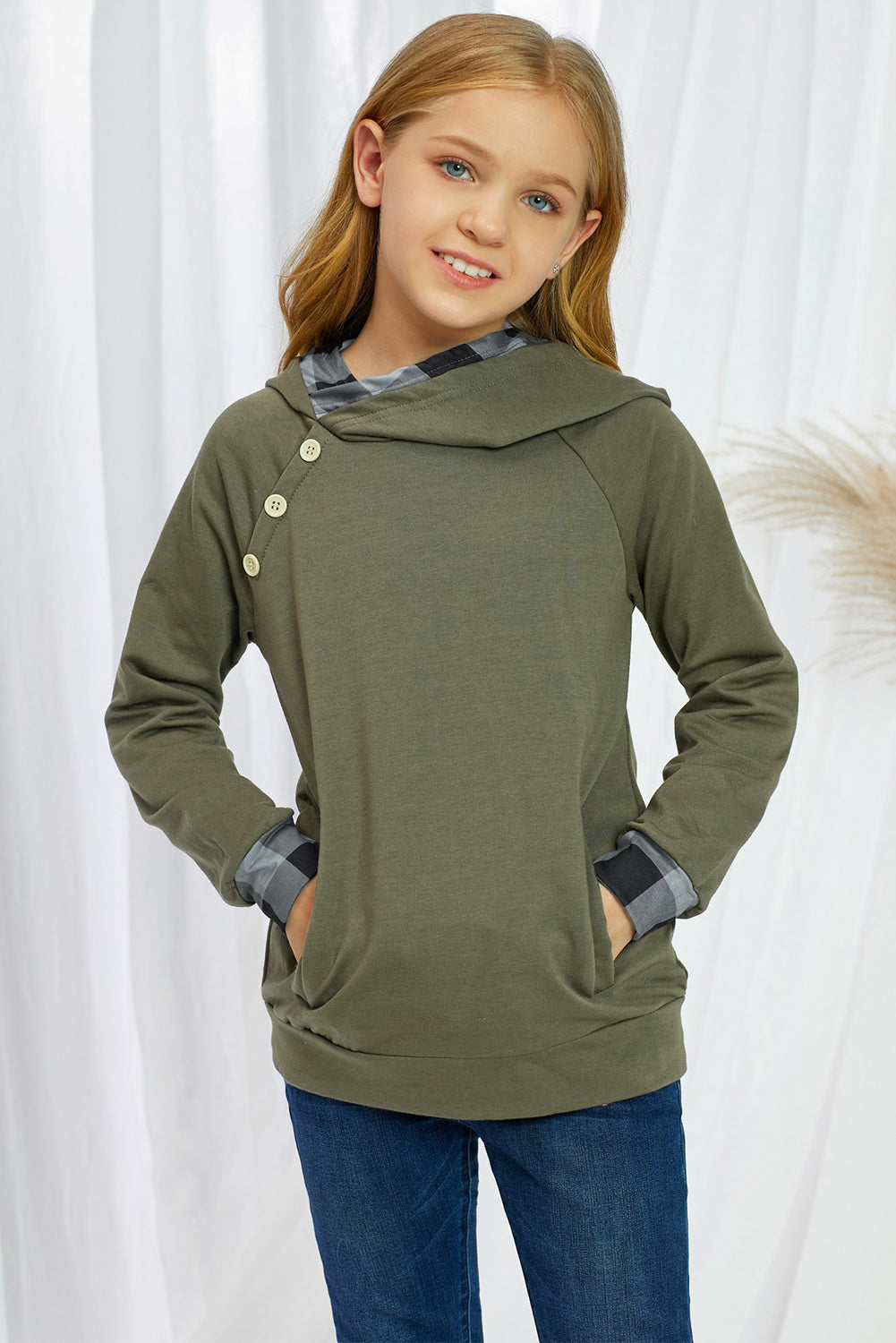 Girls Plaid Decorative Button Hoodie with Pockets